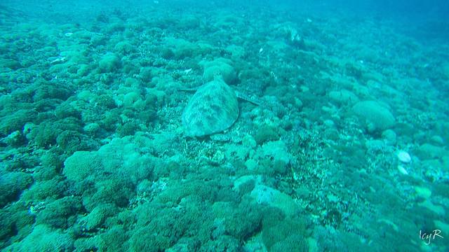 船工带着我们东游西晃,确实看到了好多趴水底的海龟,海面风浪不小,很快就游得精疲力尽,并且之前登山鞋磨破了脚后跟,又没有浮潜袜,穿着脚蹼游的每一步都如刀割啊。本来以前在泰国浮潜都没穿过脚蹼,但是印尼这边确实风浪大很多,不穿脚蹼完全就游不动。