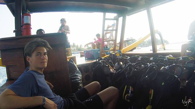 所以我们后来去跟代理谈的时候非常谨慎,最后决定5个人包一艘船,砍到750千一艘船,包含所有的浮潜装备,并没有比大船贵多少,如果游远了可以招手让船开过去接,并且时间更自由。并且我们特意要求了要螃蟹船,就是船两边有两根柱子帮助船保持平衡,这样如果风浪太大我们可以拉着柱子浮潜。