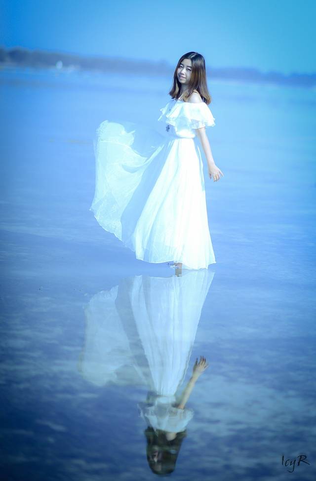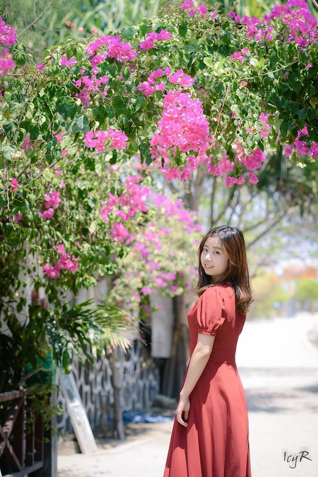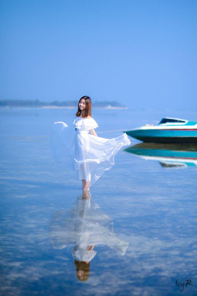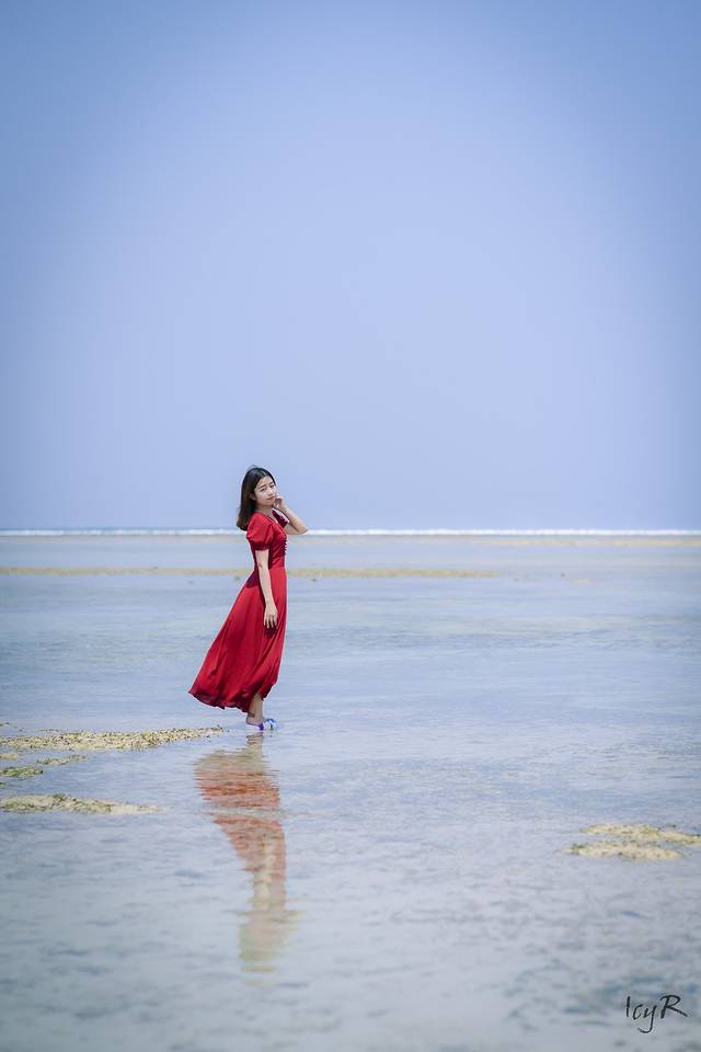 把小微叫起来拍照,这条红裙俨然已经变成我居家旅行凹造型必备战袍了。但是此时已经10点多,太阳比较大并且水面有波浪,倒影效果不明显了。