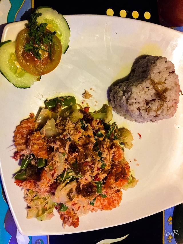 中午去了旅行家给我推荐的餐厅chill out,在Air岛的东南角,据说非常有名,性价比比较高。小伙伴们依旧在尝试各种稀奇古怪的食物,而我还是在吃印尼炒饭。。。