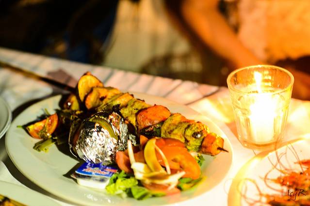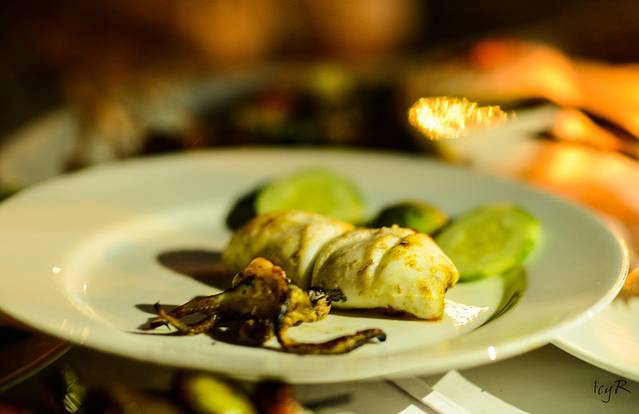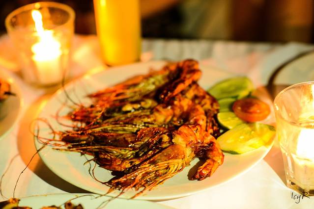 又是沙滩上的烛光晚餐,烤鱿鱼、大虾、海鱼、串烧吃起来~~