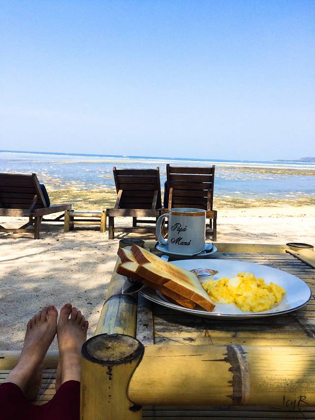 正欲哭无泪之际,突然发现朋友圈一个旅行家也在这个荒僻小岛上!这样也能偶遇!他第二天中午要回巴厘岛,说可以把Gopro充电器留给我用!并且约我第二天上午一起去潜水,本来我正有些担心,五月考完OW后一直没潜过,其他几个小伙伴又没有证,没有熟悉的潜伴一起下水有些害怕,正好他可以带我潜一次熟悉一下技巧,突然觉得整个世界都重新被点亮!哪怕全身酸痛到不行,也决定拼了老命爬起来去潜一次水~