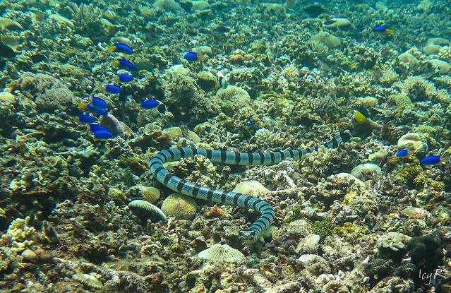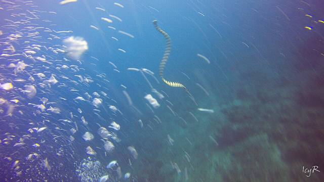 这家伙就悬浮在海水里盘旋着上升,看到它的一瞬间,我的反应是,哇,终于看到了非珊瑚非鱼非海龟的新物种!追!根本没想过它会不会咬我的问题。。。