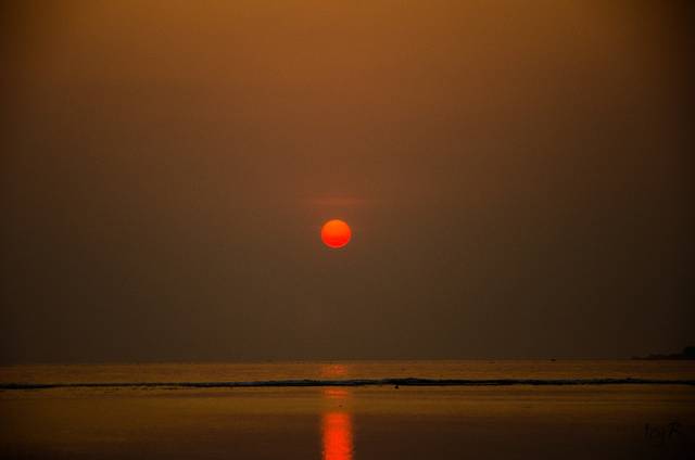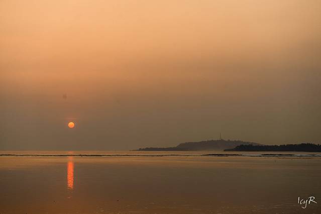 从上岛的第一天就说要去拍日落剪影,结果一直推,总想着时间还很多,结果最后一天都差点没赶上看日落。要不是小微跑来说现在的红日非常美,我还在磨磨唧唧地吹头发。。。但是因为空气质量原因不够通透,虽然能看到很红很红的太阳,但是没有灿烂的晚霞和好看的前景。太阳落得很快,还没来得及拍几张剪影,就藏到云层下面去了。