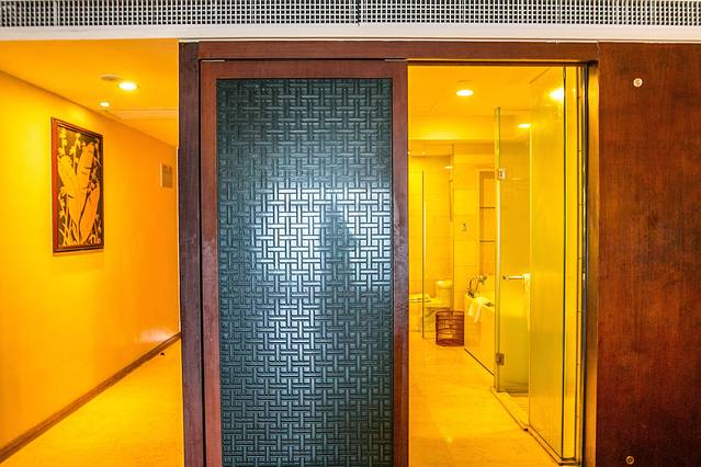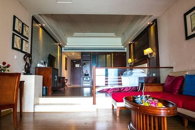 凭房卡乘电梯抵达专属楼层。进到房间,整体中式典雅的家居和色调与大空间相得益彰,分隔开来的会客茶室直接连通外面的海景阳台。
