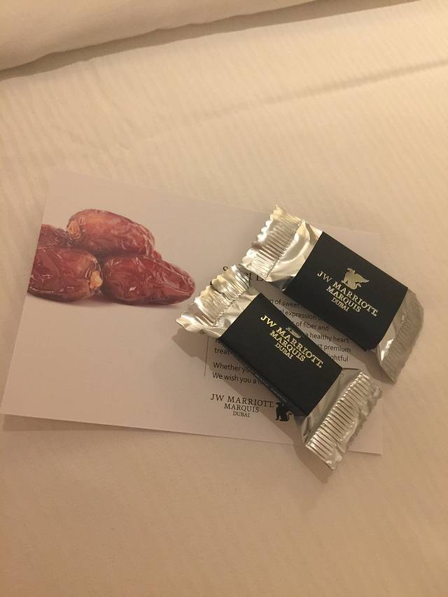 我们入住的JW万豪酒店,号称全球最高酒店,我们要的楼层高的房间,酒店的大落地窗看下去风景无敌好,可以看见哈利法塔激动坏了你可以在这里随便拍尽情发挥酒店给我们送了当地特产椰枣,讲真的甜的受不了不好吃……