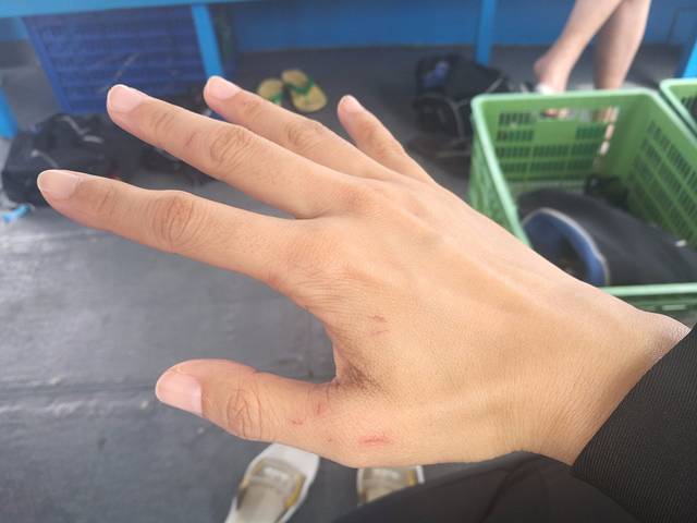 另外,建议买潜水袜和手套,要不然如果中性浮力不好,分分钟被水底的珊瑚刮到遍体鳞伤……就像我,第二潜夜潜下去,脚就被火珊瑚给蜇伤了。。。后来手上也不知道哪里来的伤痕~