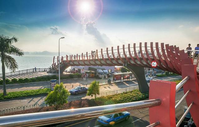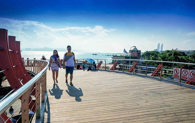 1、站在曾厝垵入口的人行天桥拍张照,因为流畅的线型和鱼骨状设计,也被称为“渔桥”。这座桥连接着海滩和大海,站在桥上拍出的照片非常美丽。