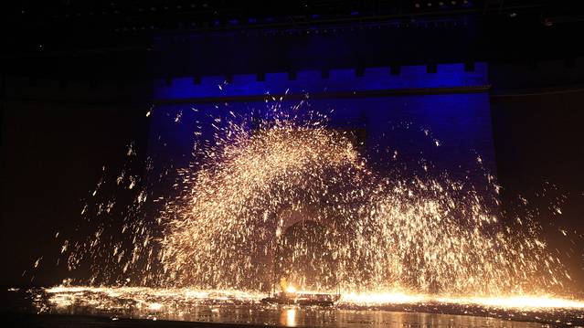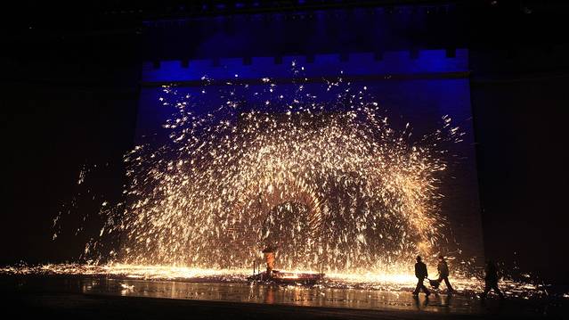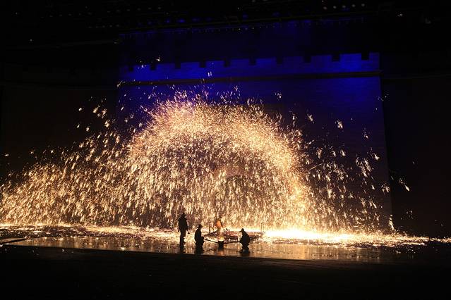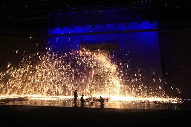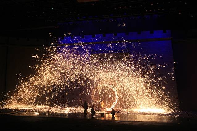 由于“打树花”这项活动着实准备起来不容易,因此以前的“打树花”真的只有在正月里地那几天才会在暖泉城外上演;而从今年开始,一切都变了,暖泉镇在古堡外修了一座大剧场,并且请了国内著名的导演,根据暖泉古堡曾经流传的一段爱情故事编排了一场大戏,将这只有在寒冬才进行的“打树花”活动与现代的舞蹈、武术、杂技、声、光、电有机的整合在了一起,这场大戏的名字就叫《天下第一堡》!