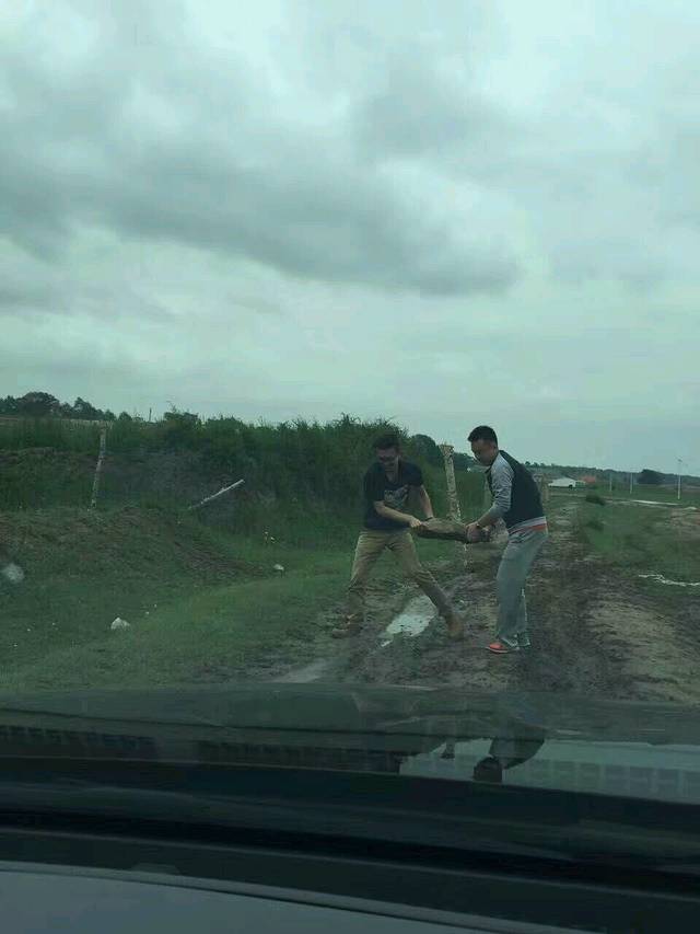 然后小伙们就说垫砖,问题是这一大片湿地上哪里找砖啊?结果发现不远处有一处房子,门口码的砖我们就立刻行动起来搬砖去,反正当时也没人,我们就当是无主的了。