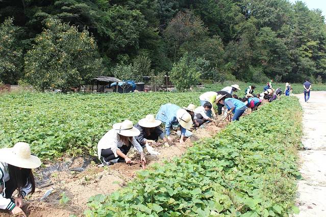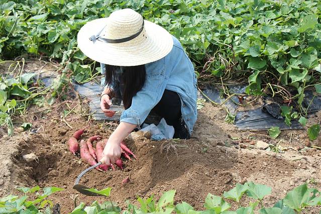 在全罗北道完州郡的五福村里,还有采摘红薯的体验~每个人带个小草帽,就可以下地干农活了呢~挖红薯也是讲技巧的,找到红薯以后,把它周围的土都刨开,抓住头摇晃并拔出。快来看看我们的劳动成果,看谁挖的红薯最大!