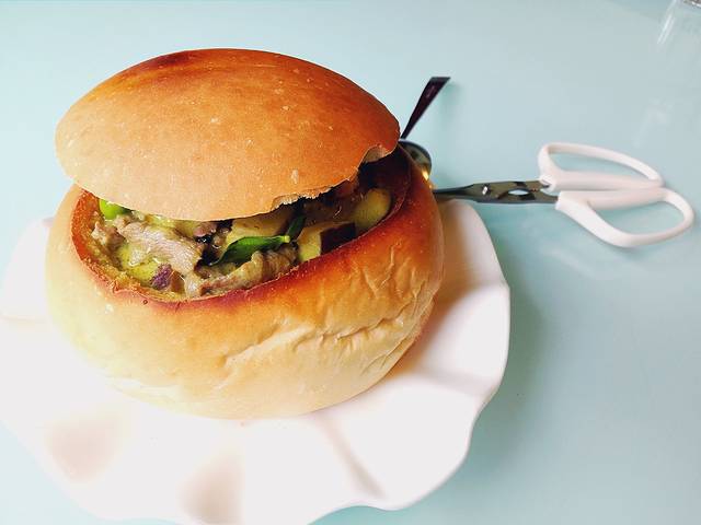 青咖喱牛肉面包(78葡币)~咖喱有黄咖喱红咖喱和青咖喱可以选择,也可以选择不要面包,然……面包和咖喱可是绝配!青咖喱微辣,不会太稀,味浓,里面的茄子和一种我不认识的青豆,我特别喜欢。而咖喱汁浸透在了面包里,特别美味!牛肉也不会老,反而是嫩嫩的口感,又被咖喱所融合!至于那个面包则外面烤得焦焦的,里面却很松软,一吃就知道是自己家做的,不是外面买回来的那种~另外,上菜时还会配上剪刀,一个细节足见其贴心!