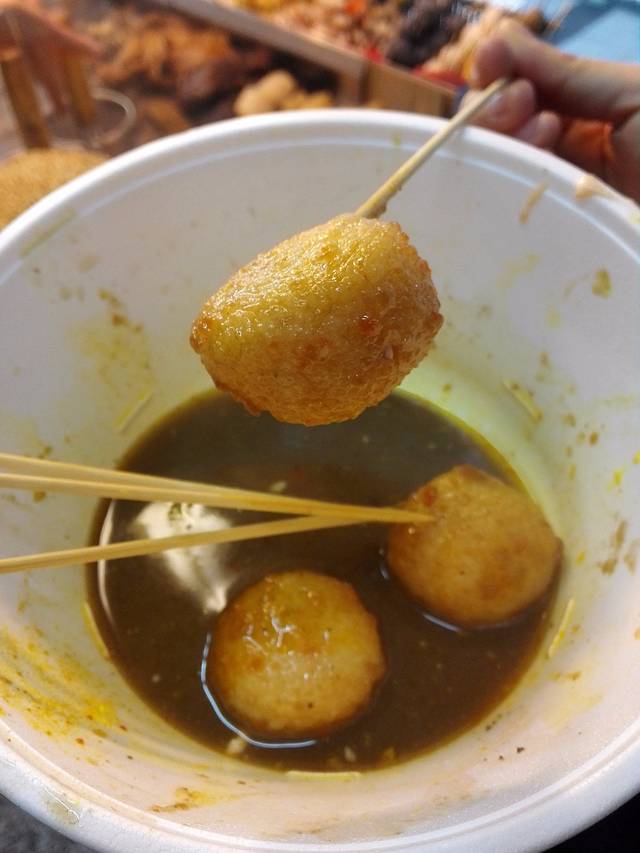 吃完荣记,没走两步就见到了恒友鱼旦,上次来吃估计是10年前了~在我的记忆中他家的鱼蛋是没得说的!特别是芝士丸。但这次因为刚吃了荣记,所以太饱了只点了三串素食加一串芝士丸!芝士丸同样是爆浆的,而且口感QQ的,其实和荣记的差不多,但是他家是要比荣记更胜一筹的,胜在他们家的秘制汤底,味道更佳浓郁香甜,建议吃辣的,更美味!汤底我们都完全喝光光了~