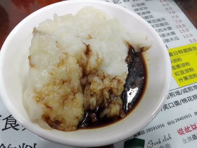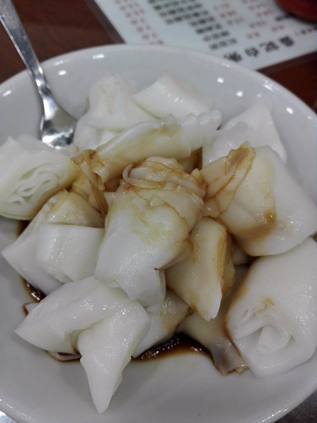 肠粉。它只加了一点点的酱油,而花生酱、甜酱等我们可以自己加,加入以后和香港的混酱肠特别像~非常好吃!