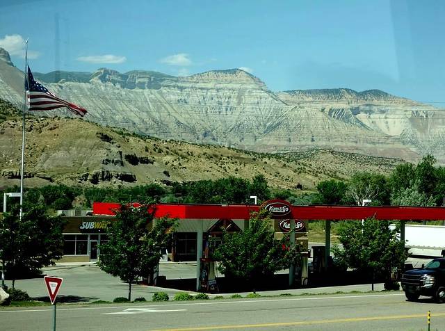 这是途径的一个加油站,后面的落基山山崖上已经有树林,加油站里也是绿树成荫。