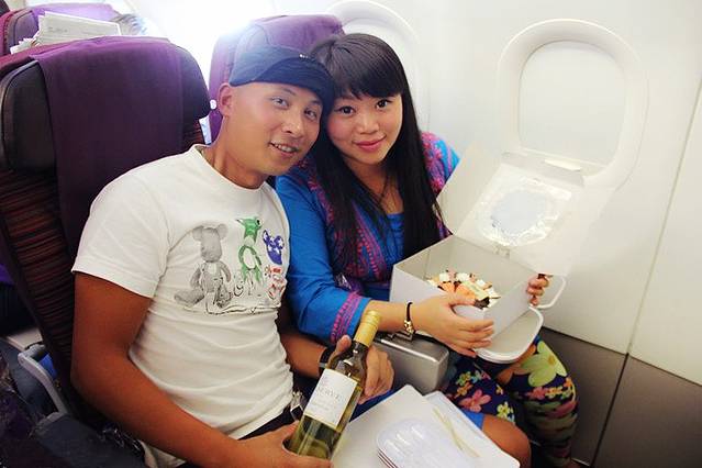 这次泰航搞了个活动,凡是夫妻或者情侣购买泰航不同舱位的飞机票,可以有不一样的优惠和礼物赠送哦。看我和男友手上拿的就是赠送的蛋糕和香槟。