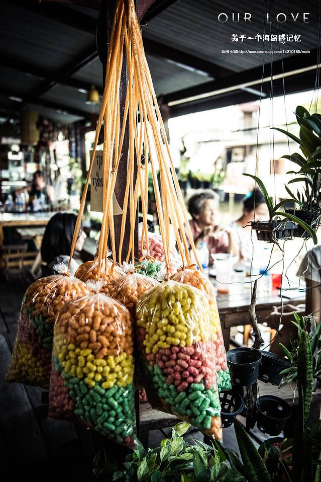 游客可以在这里用餐小憩。我们在这里学习了泰国民俗小吃的做法,一种是用叶子包着各种馅料蘸着作料吃,一种类似于中国的汤圆,也是外面用一种粉搓成团,包着花生甜馅,煮开以后皮儿亮透馅儿香甜,吃着自己亲手学习制作的泰国小吃,那味道确实不一般啊,非常好吃!