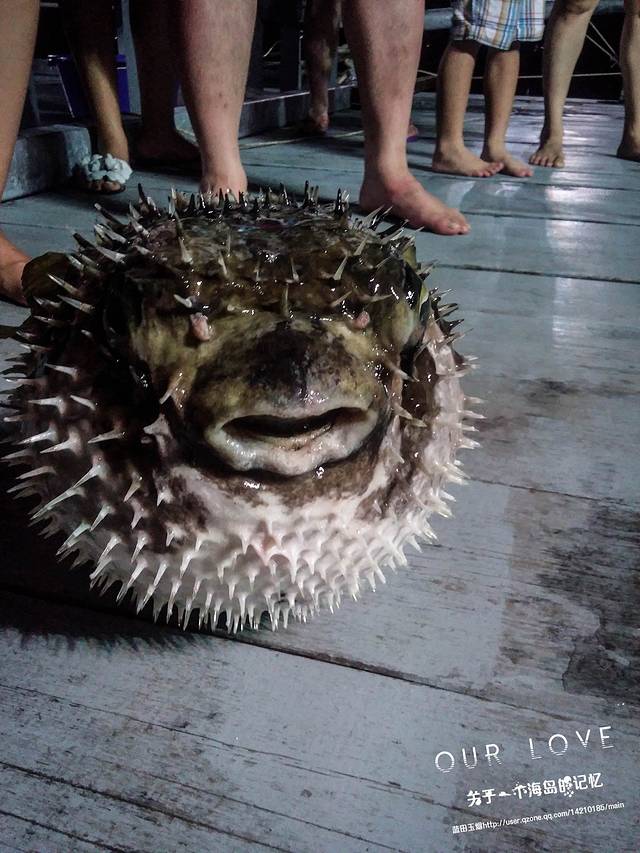晚上我们在下午最后的沙滩那里,出海钓鱼,价格很亲民哦,一人一百人民币左右。最初是用线钓乌贼墨鱼,最后变成撒网打捞,有捕到河豚,最后放生。
