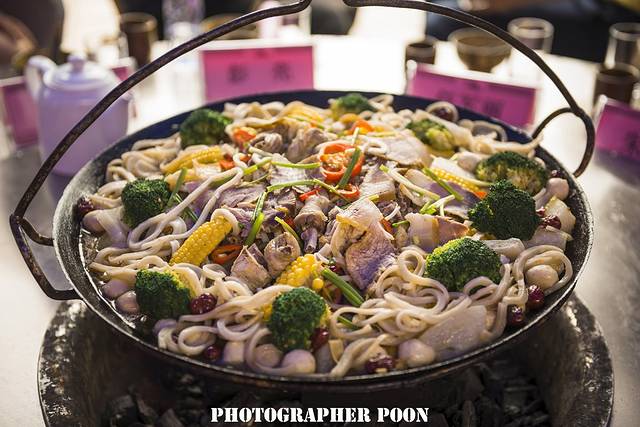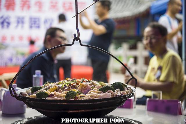 吊锅作为罗田传统经典的特色美食,果然名不虚传。木炭火上,各类食材在铸铁锅里层层叠叠,加热的过程中更是相互融合吸收。舞台上,精彩的歌舞、魔术、小丑和二人转轮番上演,台下吊锅香气弥漫让人食指大动。