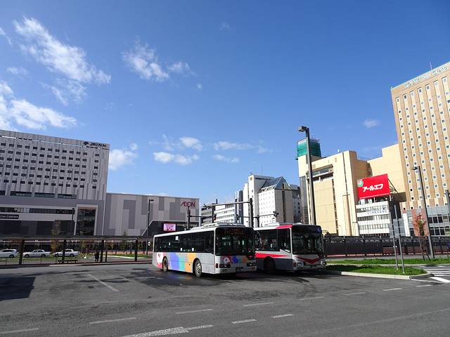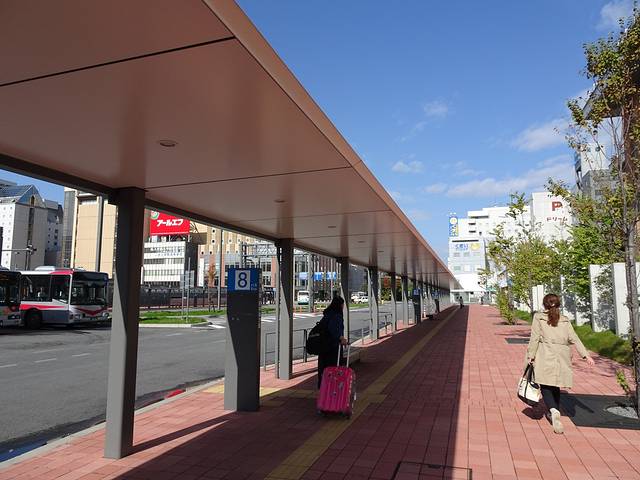 本来计划是直接乘机场的巴士到富良野,现在只能先去买个相机了,我实在没法做到全程旅游用手机拍啊。。。。朋友到了航,在旭川市区有电器店,于是临时改变方向,因为机场没有寄放行李的地方,所以我们只能带着行李去机场出口乘坐到旭川站的巴士。