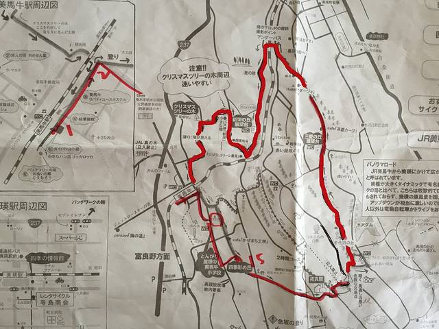 工作人员会给你张地图把路线画出来,如图红色路。这里我不得不要吐槽下这个地图!不精准啊,距离也都不太对,要是真能按照这个地图走完全程我也是服了!反正我后面就一直在迷路,因为手机没装导航,导航在朋友那里,她不会骑自行车!虽然出发前我曾经突击教过她两天,但是她连上车都不会啊。。。所以到后面就是我骑一段,等她一段,前半天还好,到了下午有一段路分开以后,就一直没汇合上,然后我按照地图妥妥地就迷路了,至少绕过三次大圈子!中间的小迷路就不提了!在这里骑行一定要带好导航!