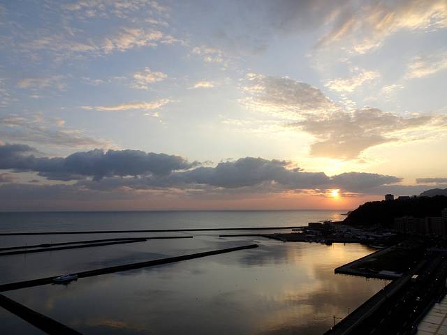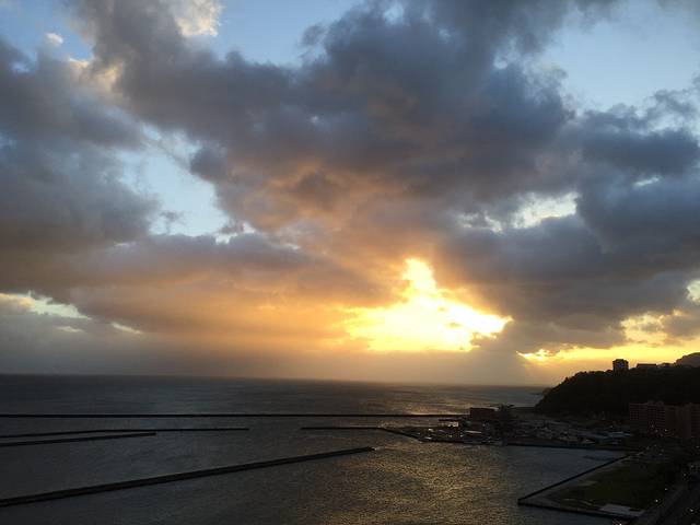 早上5点半醒来一次,看了看窗外,天上还灰灰的有点云层,心想今天大概就没有办法看日出了吧,倒头又睡,过了约一刻钟睁眼忽然看到从窗帘的缝隙有橘色的光透进来,赶紧再起来开出去,原来刚才是太阳都还没出来呢,这下清楚地看到一个红红圆圆的小点慢慢从海平面升了起来哦,心情大好,日出真的挺让人激动的。太阳慢慢上升,周围的云彩也跟着不断变幻颜色,真的好美丽。