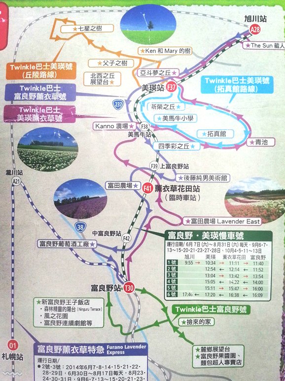 美瑛地图,美瑛站左边橘黄色的是拼布之路,右边天蓝色和紫色的是超广角之路。