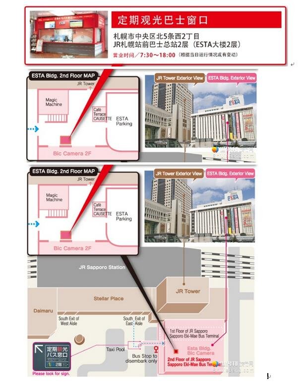 早上从小樽筑港乘JR到札幌巴士总站,购票点就在2楼,挺好找的,在JR札幌站边上,购票地点如下图示,2楼。