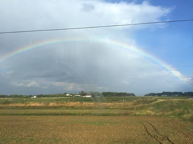 下面的图是用手机在车上拍的,看这彩虹和远处的云朵啊。。。太美好了。还有田园的风光实在是来不及拍了。