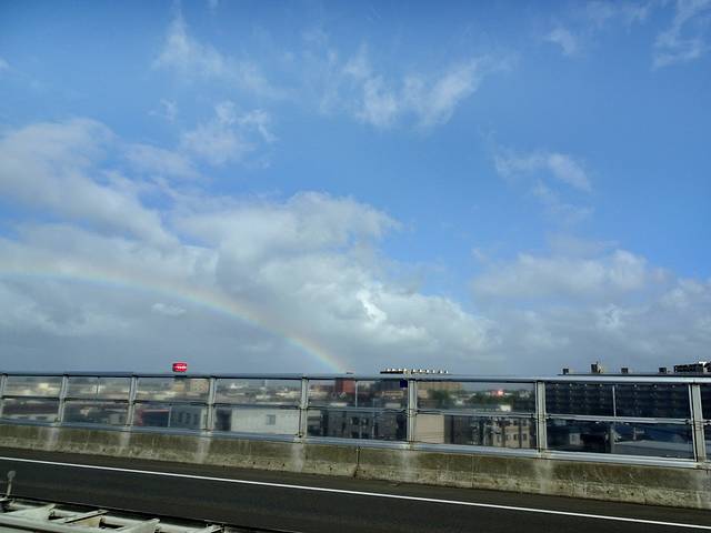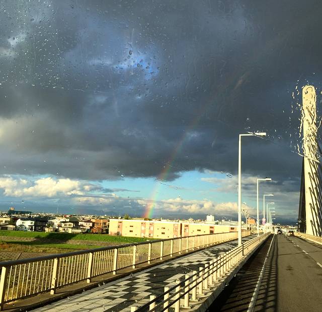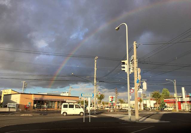 听说看到彩虹会带来好运?就在我们拿着行李到处找不到之前看到的电器店的时候,一个当地打扮得很嘻哈的大叔过来问我们要去哪里,我们说附近的电器店怎么走,他很热情地说不远,我车子带你们过去吧。如果是你,当时走还是不走?这真的是个非常巨大的考验好么,鉴于之前多次日本旅游的经验和对日本当地人民还是比较的信任,我们忐忑不安地上了车!我和朋友说,如果我们第一天就被拐卖了怎么办。。。。我在车上是随时做好跳车的准备的。。。还好,约10几分钟,顺利到达附近的100满电器店,大叔让我们上去买东西,他在下面等我们,行李就放他车上。