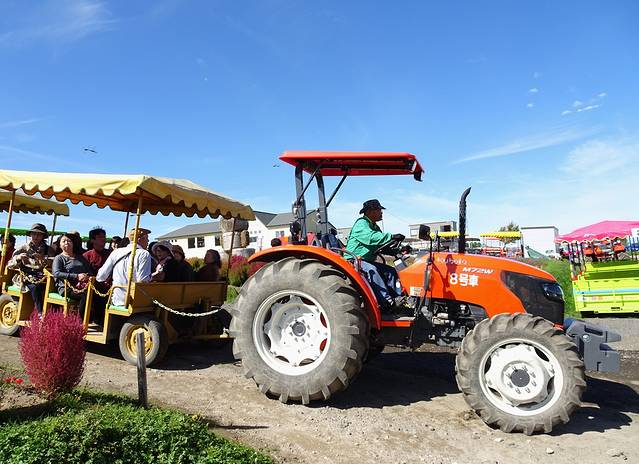 游客可以乘坐拖拉机的小列车在花田里游览,到了几个点会让游客下车拍一下照。