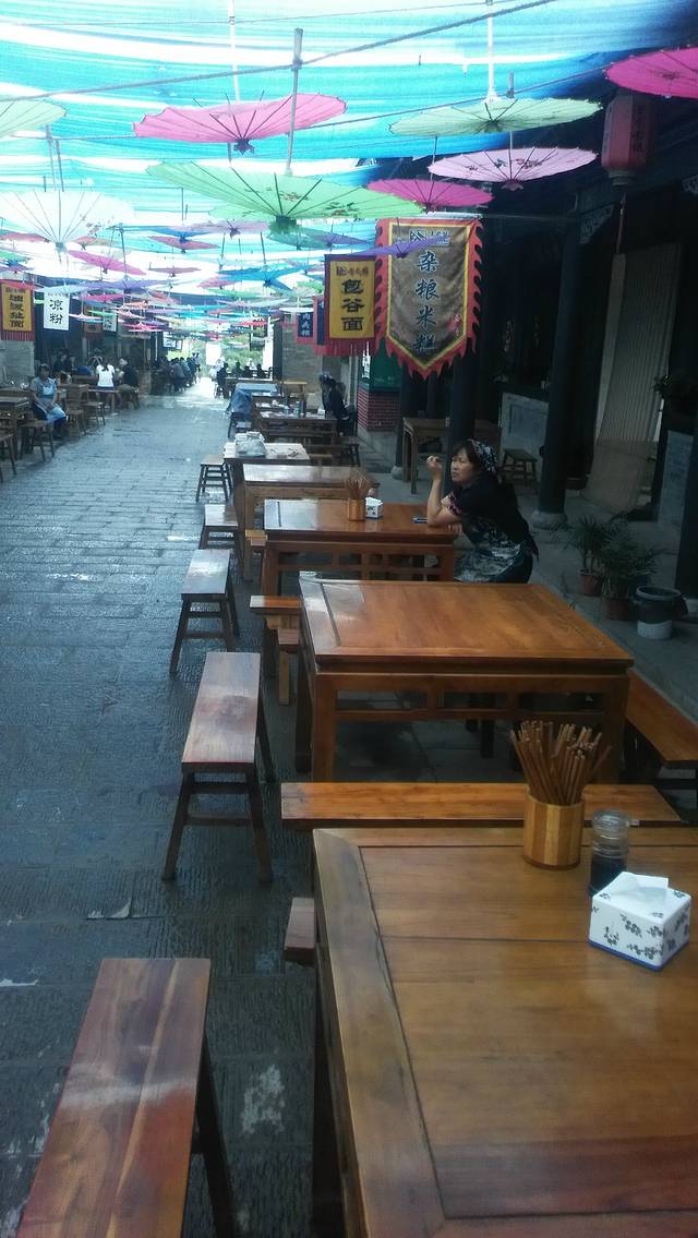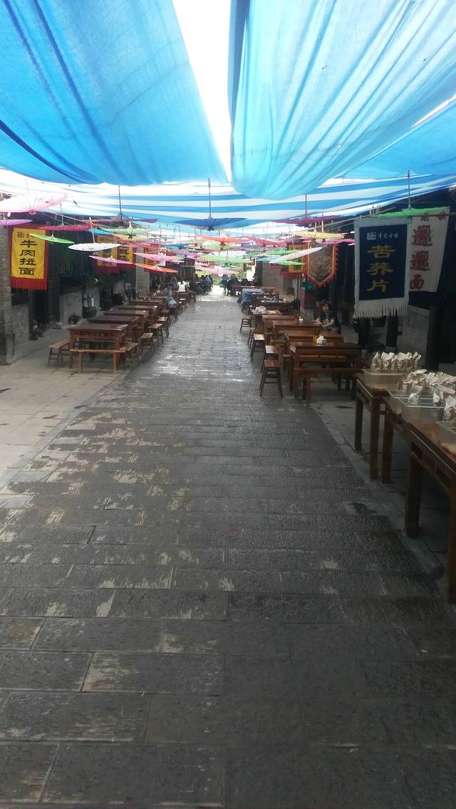 挂着形形色色的幌子的小吃一条街,各种现代的用具与穿着传统服饰的小二娘形成了一种非常和谐的景象。
