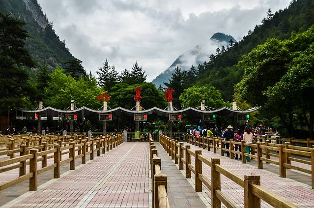 从沟口进入景区必须乘坐景区的观光车,一般观光车是从沟口到景区方向是不停任何景点区域的,都有车上的讲解员进行简单介绍一路上的景点。返程的时候才会每个站点停靠游览。采取公交车的流水班线方式运营的。