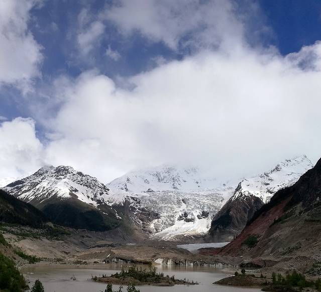 早上八点出发,遇到了一个来自佛山的老乡,他们说昨天在天路72拐还看到了日照金山。我们一早往先去了然乌湖,山水一色,路上还有牦牛,拍了很久的照片。因为限行,两点放行,我们塞车塞了快三个小时才离开然乌湖往米堆冰川赶。随便吃了点东西到米堆冰川大概下午一点。米堆冰川海拔不算高,在停车场停车以后可以选择徒步上山和骑马上山。骑马来回大概200块,节省体力。我们选择徒步上山,路比较平缓,大概要走45分钟到山顶,比较辛苦的是要走一条较长的持续向上的楼梯,过了楼梯后三分钟马上就到观景平台。米堆冰川不大,可是很美(一直用很美,因为真的到处都没)