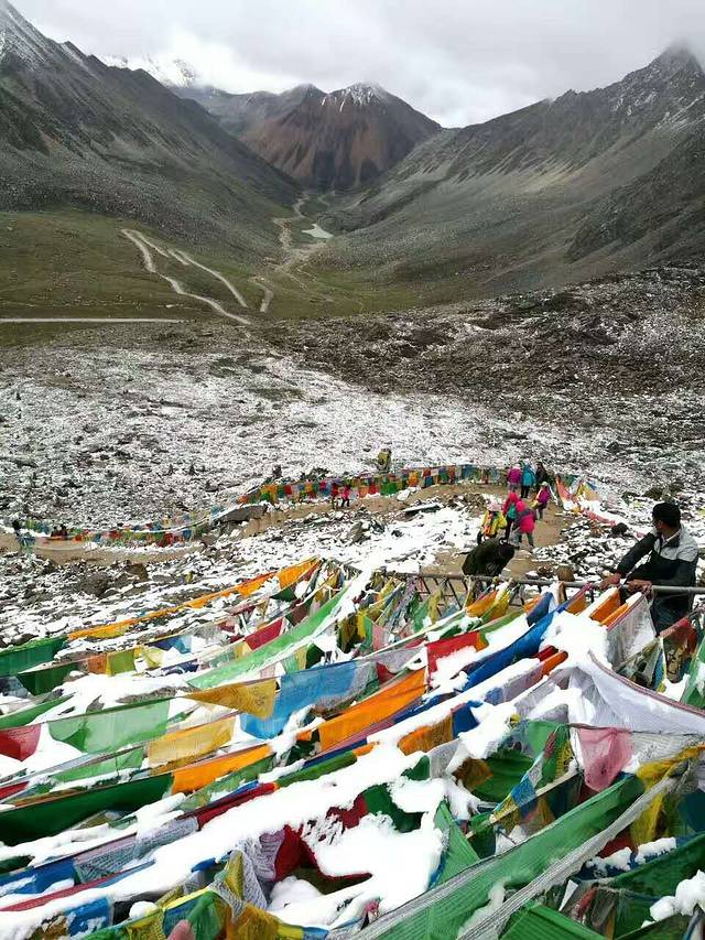 早上八点出发,前往神湖拉姆拉措。这里管理很严格,里面限速管理也很厉害。一路上山,恍如进入仙境一般,穿越在云海。到山顶海拔5000+,一下车就下雪,这个时候要把厚衣服全穿上。停车以后,还需要自己爬几百米到山顶才能观望神湖。传说凝视神湖能够看到前世今生,除了游客,大部分是当地虔诚的百姓前往。一路爬山一路下雪,山顶海拔5417,比珠峰大本营要高出些许。爬完山后我们每人喝了一瓶葡萄糖。建议出发前带上巧克力,吃多点淀粉类早餐满足身体需要。