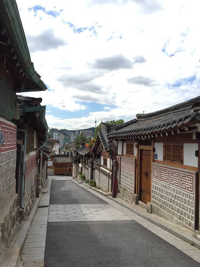 蓝天白云下的韩屋,更有一种静谧之美。好像是历史在缓缓诉说,从过去到现在的故事。韩屋村里韩屋比较多,但是游客一般直走,一条大路从头到尾就算是转完韩屋村了。