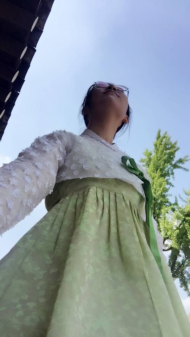 显摆一下我美丽的韩服~~~我觉得很合这个夏日呢!袖管上满是白色的小花,还有小颗的水钻做点缀呢~