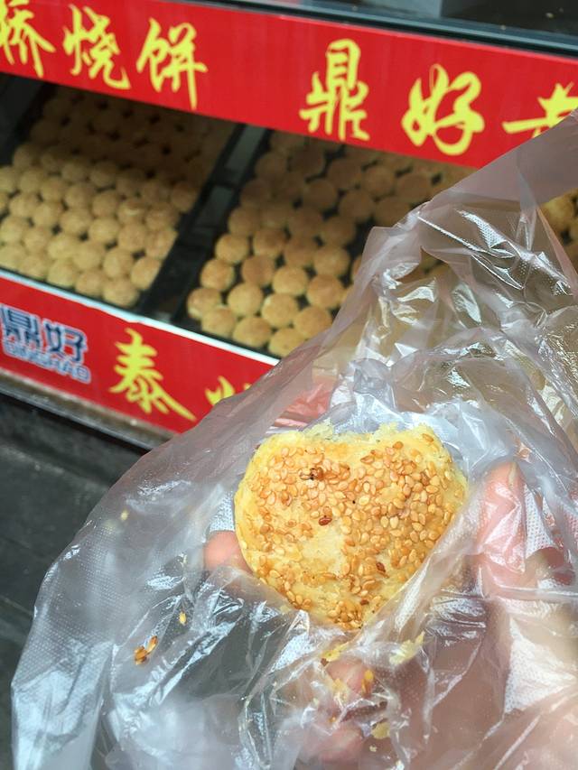 当地的特色是黄桥烧饼,买了个椒盐的,味道其实挺普通的