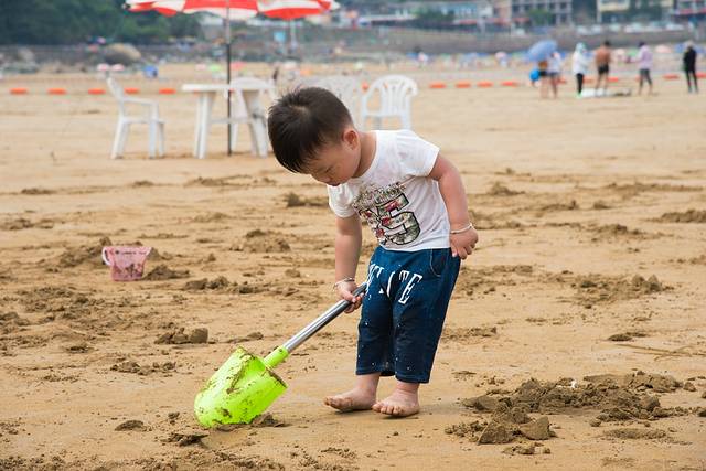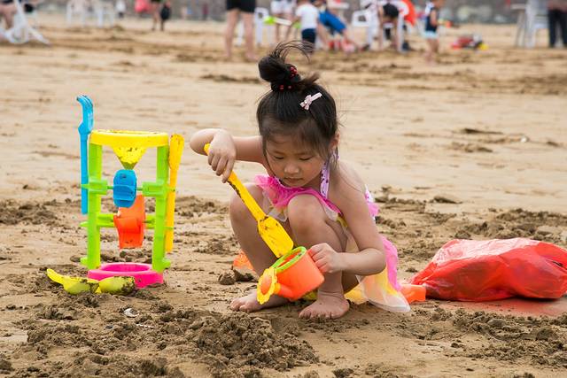 临近傍晚我们到达渔寮沙滩,便看到一个稚嫩的孩子裹了一身泥在爹爹的催促下奔跑回家。可是,孩子已然意犹未尽,时不时停下来抓一把沙子,甚是可爱。也有很多其他的孩子,带了沙滩玩具,将沙滩想象成了一个厨房,用小工具舀着菜肴,乐此不疲。