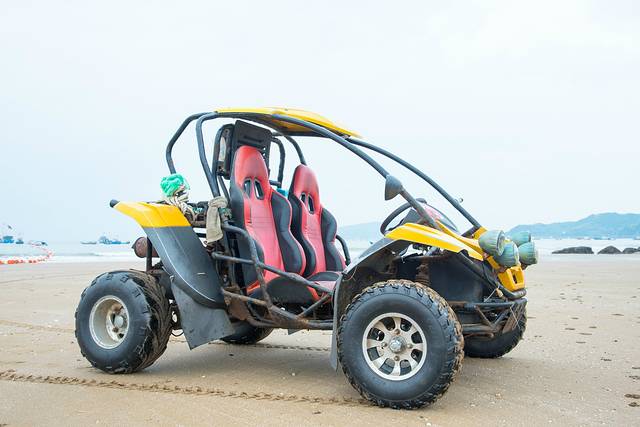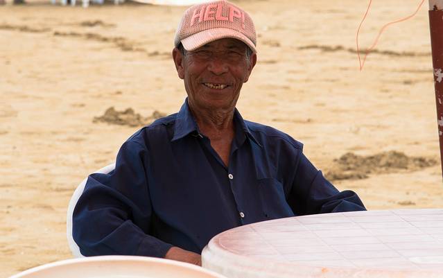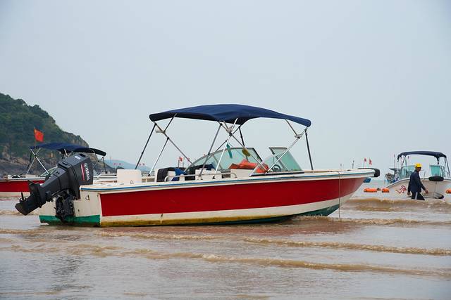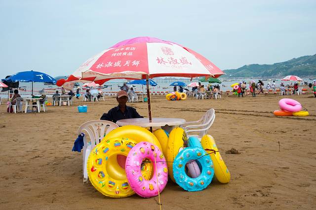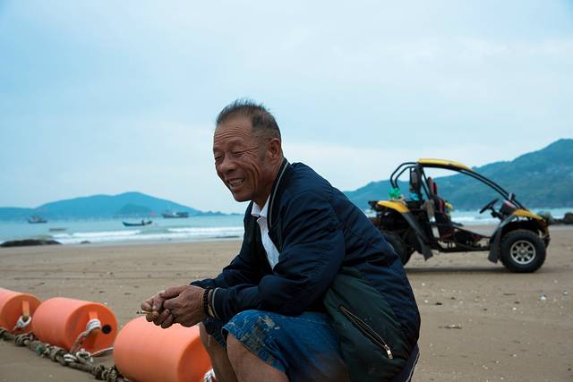 刚下渔寮沙滩时可以感受到非常柔软的沙质,很细、很舒服。慢慢往沙滩中间走,沙子右边粗了起来,靠近大海的时候便是滩涂了,但是地面还是很平整,并不会陷进去。靠近岸边有很多的座椅和遮阳伞,游人在这里休息、品茶,晒晒太阳。还有卡丁车,隆隆声想起,是一件很酷的活动,颇受孩子欢迎。这些卡丁车归于一位老伯伯,我听不懂苍南的方言,却看得出他的日子也很快乐。