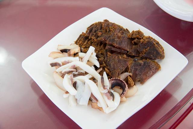 第一盘:牛肉。温州最出名的牛肉产自湖岭,用中国传统的方式制作,口味香浓,食之带着嚼劲。
