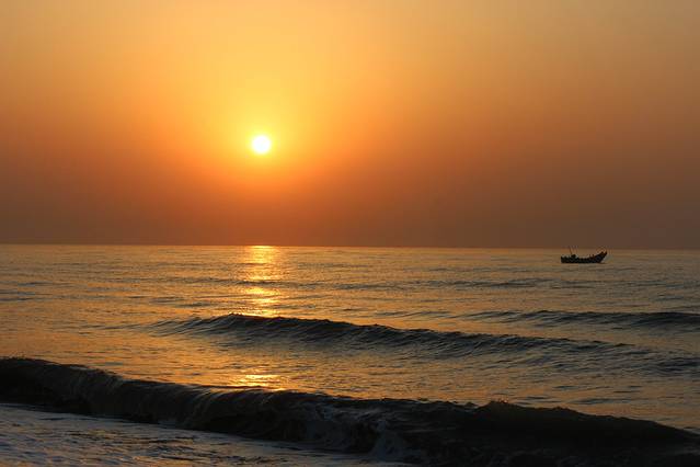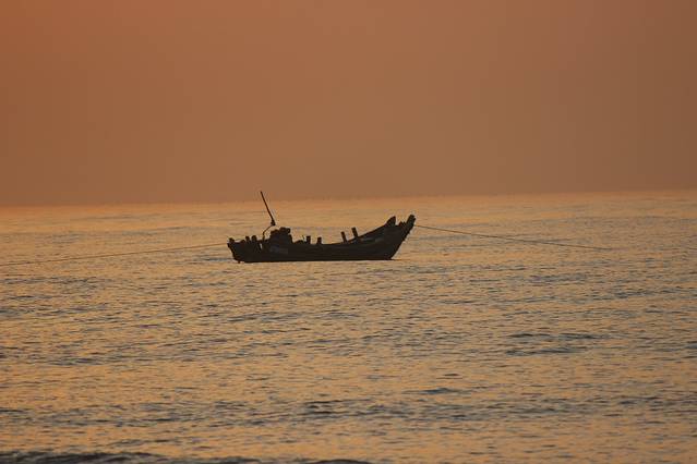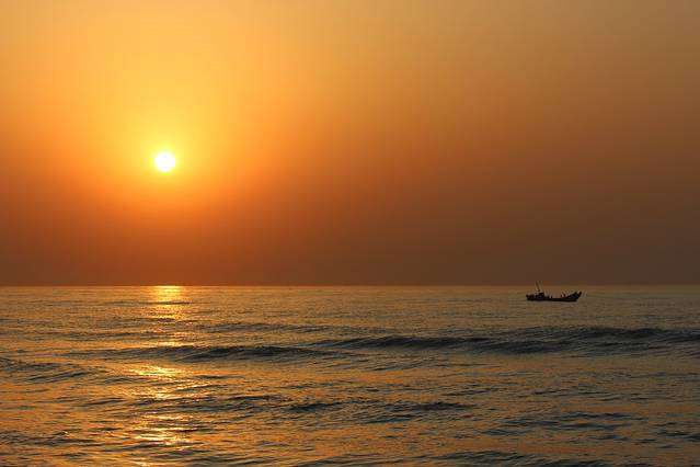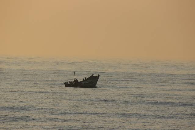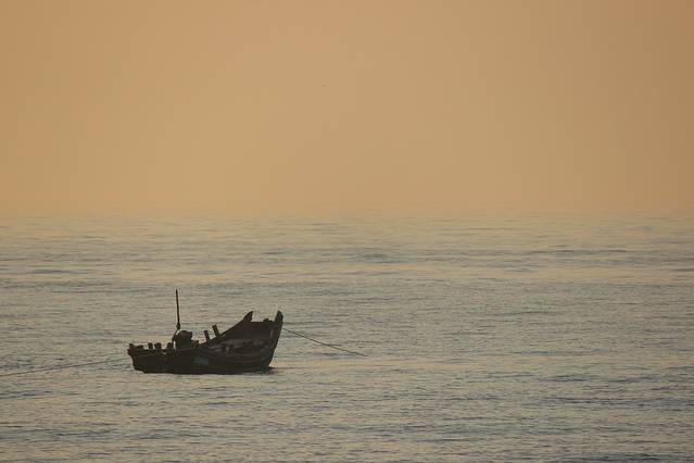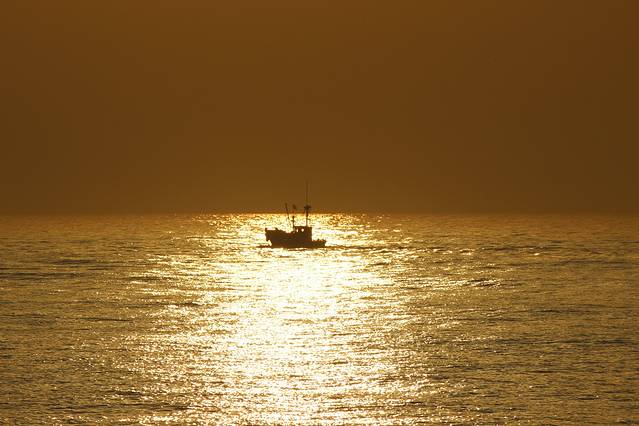 阳光洒下的时刻,刚好一艘渔船通过那一缕日光之下。初升的太阳伴着早起的渔民出海打鱼