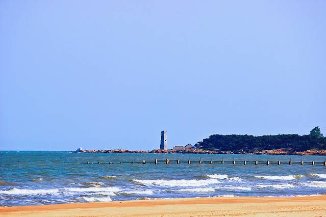 蔚蓝的大海,柔软的沙滩,以及远处的灯塔