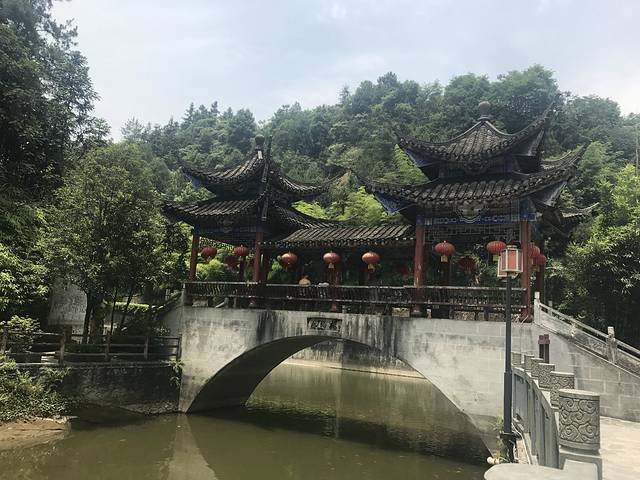 这座仿古风雨桥,两座桥亭耸立于桥廊之上,飞檐翘角,画栋雕梁,十分精致美观。风雨桥多建于河流渡口之处,桥廊两边专设有栏杆和长坐板,以供肩挑背驮的商旅行人歇气纳凉、遮荫避雨,因而称"风雨桥。"这座风雨桥,虽无挑担背力的行人过往,但却是游人歇息或休闲纳凉、聊天、摆龙门阵或恋人幽会的绝好地方。
