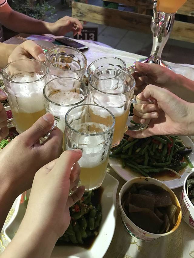 舟车劳顿,又爬山爬了一天,每个人都精疲力竭了。回到客栈后,拖着疲惫的身躯一群人去大排档吃烧烤喝扎啤,这是我们来的这两天里吃的最棒的一顿大餐。