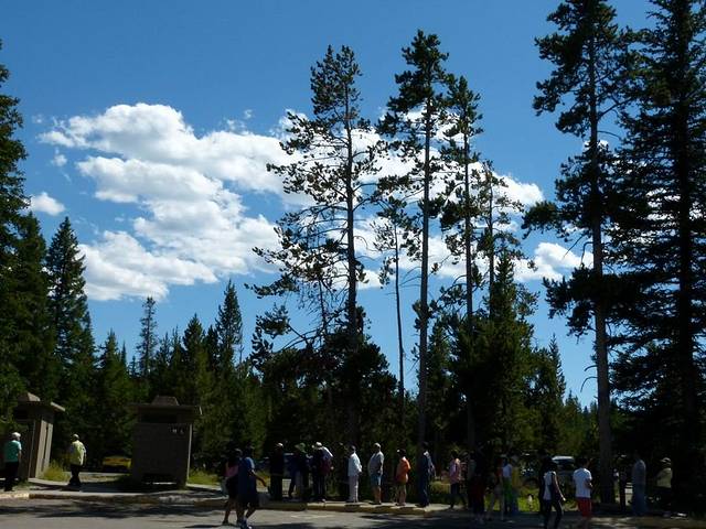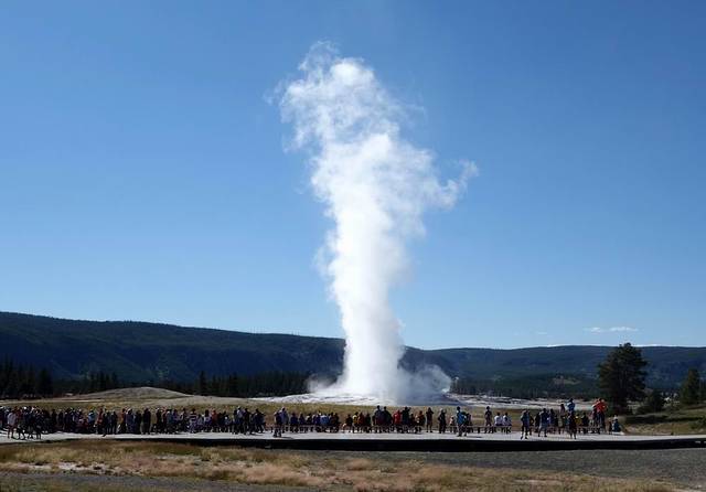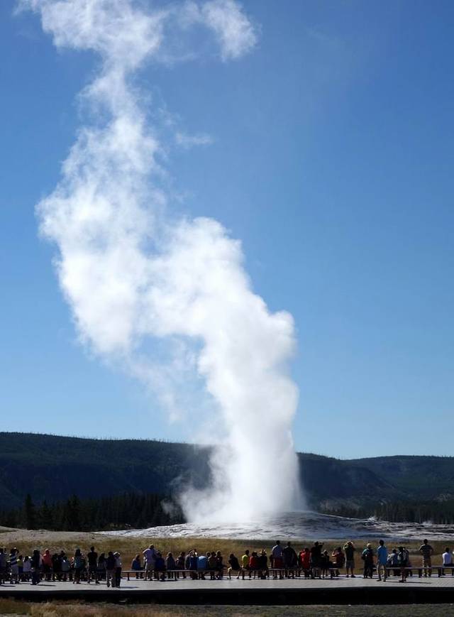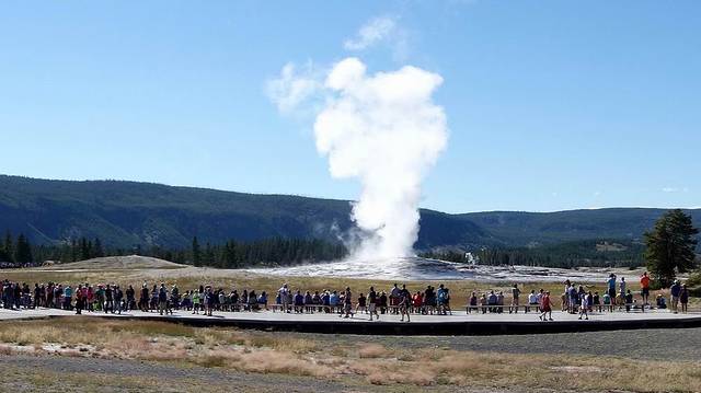 在一百多年前,黄石刚刚被设立为美国第一个国家公园的时候,游人们来到黄石,主要是为了亲眼看到那里独特的地热景观,尤其是老忠实喷泉。到了今天,老忠实喷泉依然是黄石公园的象征,可能也是黄石公园最有人气的地方了。喷发结束,撤退的人流如潮。