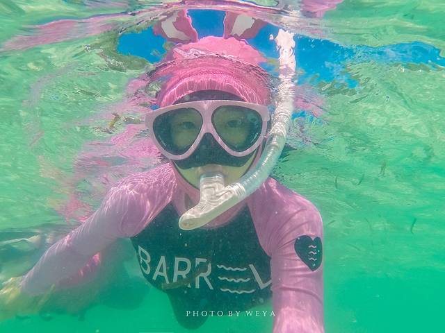 因为不想防晒霜破坏海洋水质,所以我是不擦防晒霜下水的,为了防止被晒伤,我即便是浮潜也穿上了长袖长裤的水母服。再加上这个头套的保护,已经可以抵抗大部分紫外线的侵蚀了。