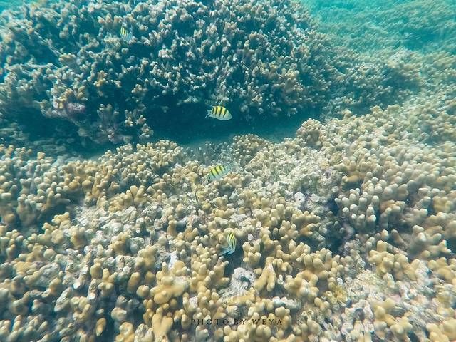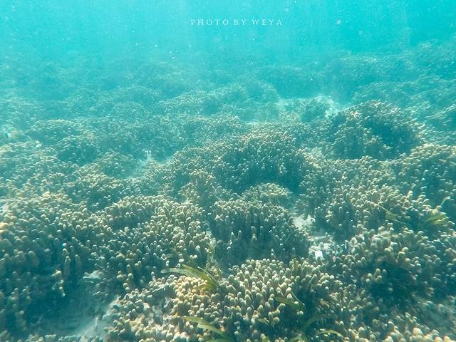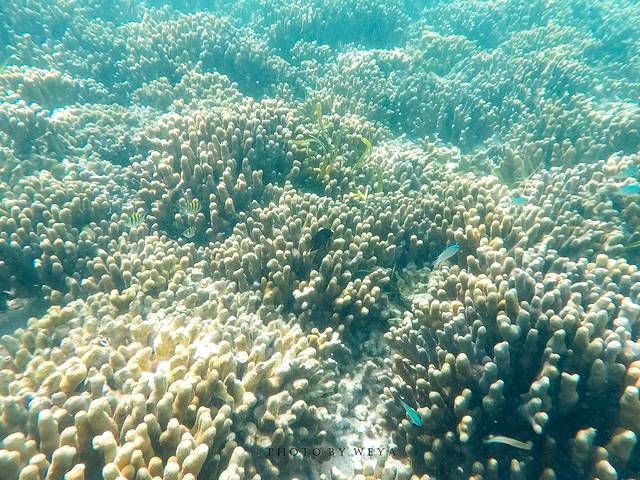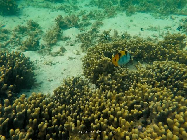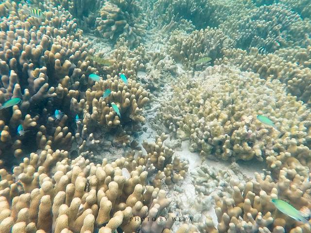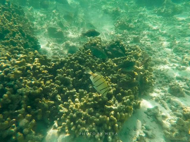 白金岛因为太大了,周围的珊瑚 分布得还算均匀,就在自己住的沙屋门前下水就可以看到不错的珊瑚与成群的小鱼。