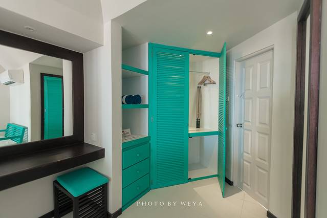 蓝色的浴巾是可以带出去浮潜用的,除此之外,衣柜里还有雨伞和密码保险箱。