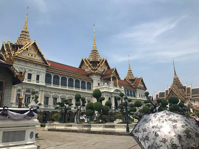 都是打卡项目哈哈 大皇宫和玉佛寺联票的,当时我们请了讲解,是一个华裔在泰国出生长大的老奶奶,中文很溜,1000株讲解玉佛寺和大皇宫。还没买票的时候外面就碰到很多人,问要不要讲解,第一些我们以为这些人是不正规的。买完票后旁边有租讲解机器的地方,问了那里的工作人员,才知道要请人讲解的话就是那些人😂😂要请讲解的小伙伴留个心,可以提前找好了,别像我们还要走出去找人。不知道是不是因为老国王遗体在大皇宫存放的关系,我真正游览的是玉佛寺啊!大皇宫就是在外面拍了个照,听了下讲解
